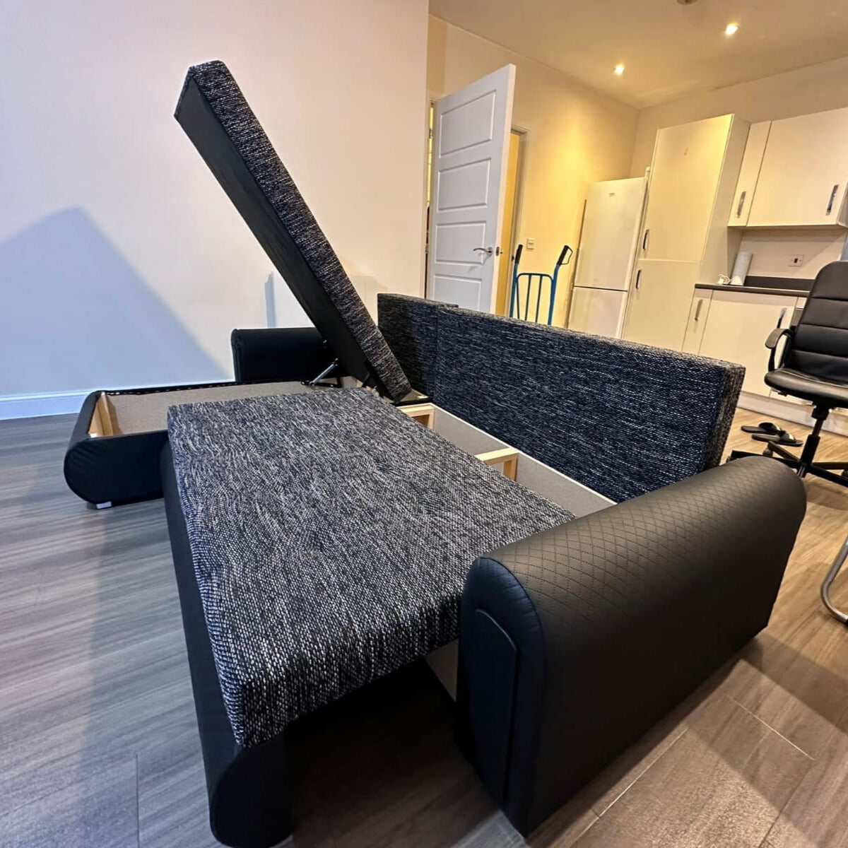 - Our Universal Side Sofa Bed with Storage features both right and left arm configurations to suit your living room layout and personal preference. Please note that the wardrobe itself is not configurable and comes as a standard design.